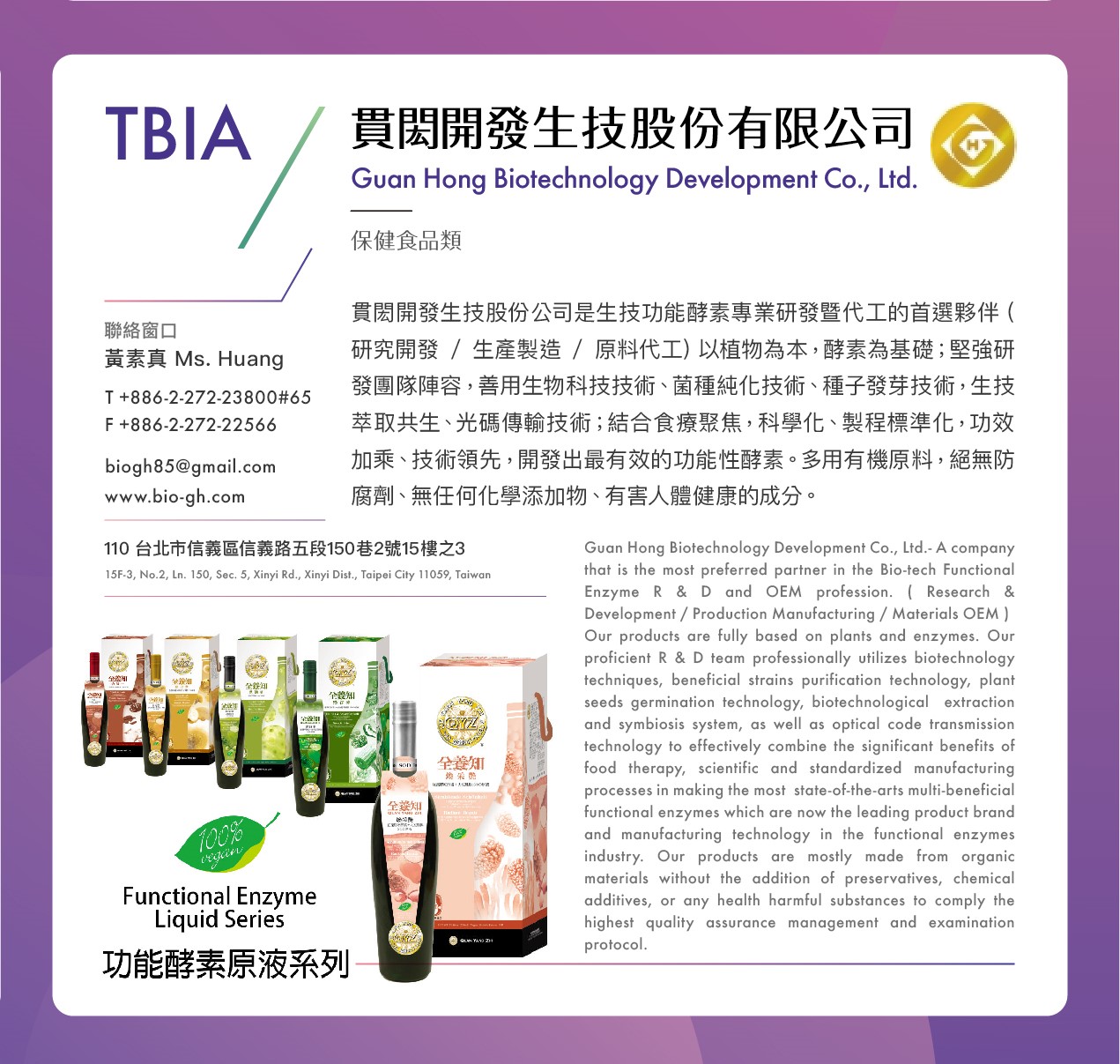 貫閎開發生技股份有限公司為專業的功能性酵素與相關產品之研發與生產公司,擁有超過10餘年的製造與研發經驗,我們的任務是提供最健康與最營養的食物補充品給現代人。