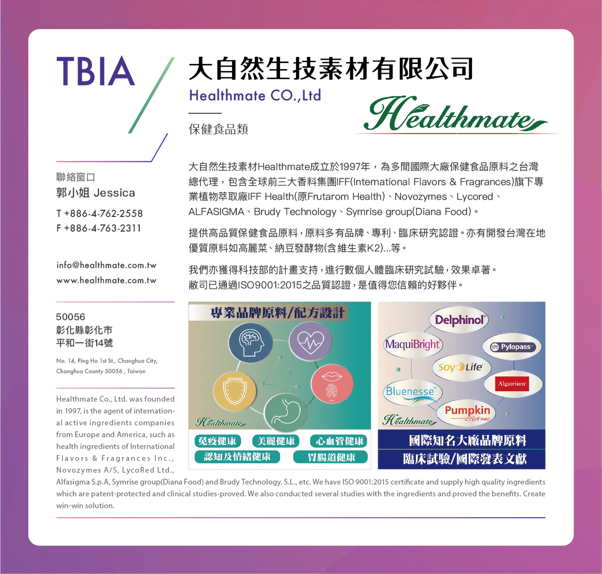 大自然生技素材Healthmate成立於1997年,為多間國際大廠保健食品原料之台灣總代理,包含全球前三大香料集團IFF(International Flavors & Fragrances)旗下專業植物萃取廠IFF Health(原Frutarom Health)、Novozymes、Lycored、ALFASIGMA、Brudy Technology、Symrise group(Diana Food)。提供高品質保健食品原料,原料多有品牌、專利、臨床研究認證。亦有開發台灣在地優質原料如高麗菜、納豆發酵物(含維生素K2)...等。