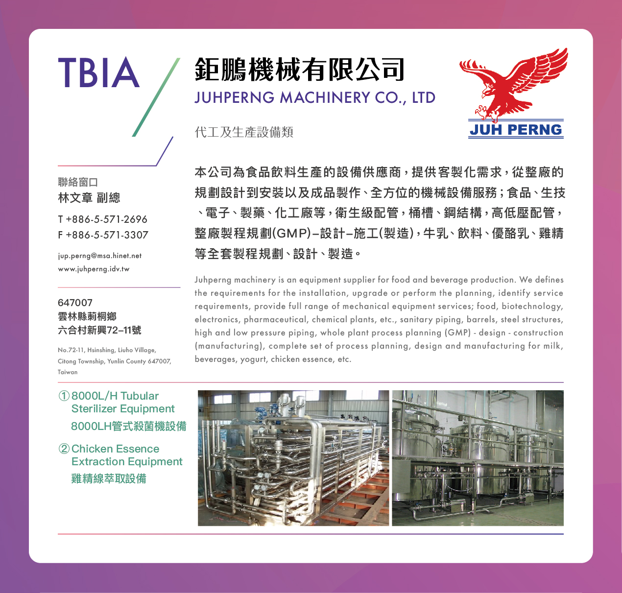 本公司為食品飲料生產的設備供應商,提供客製化需求,從整廠的規劃設計到安裝以及成品製作、全方位的機械設備服務;食品、生技、電子、製藥、化工廠等,衛生級配管,桶槽、鋼結構,高低壓配管,整廠製程規劃(GMP)-設計-施工(製造),牛乳、飲料、優酪乳、雞精等全套製程規劃、設計、製造。