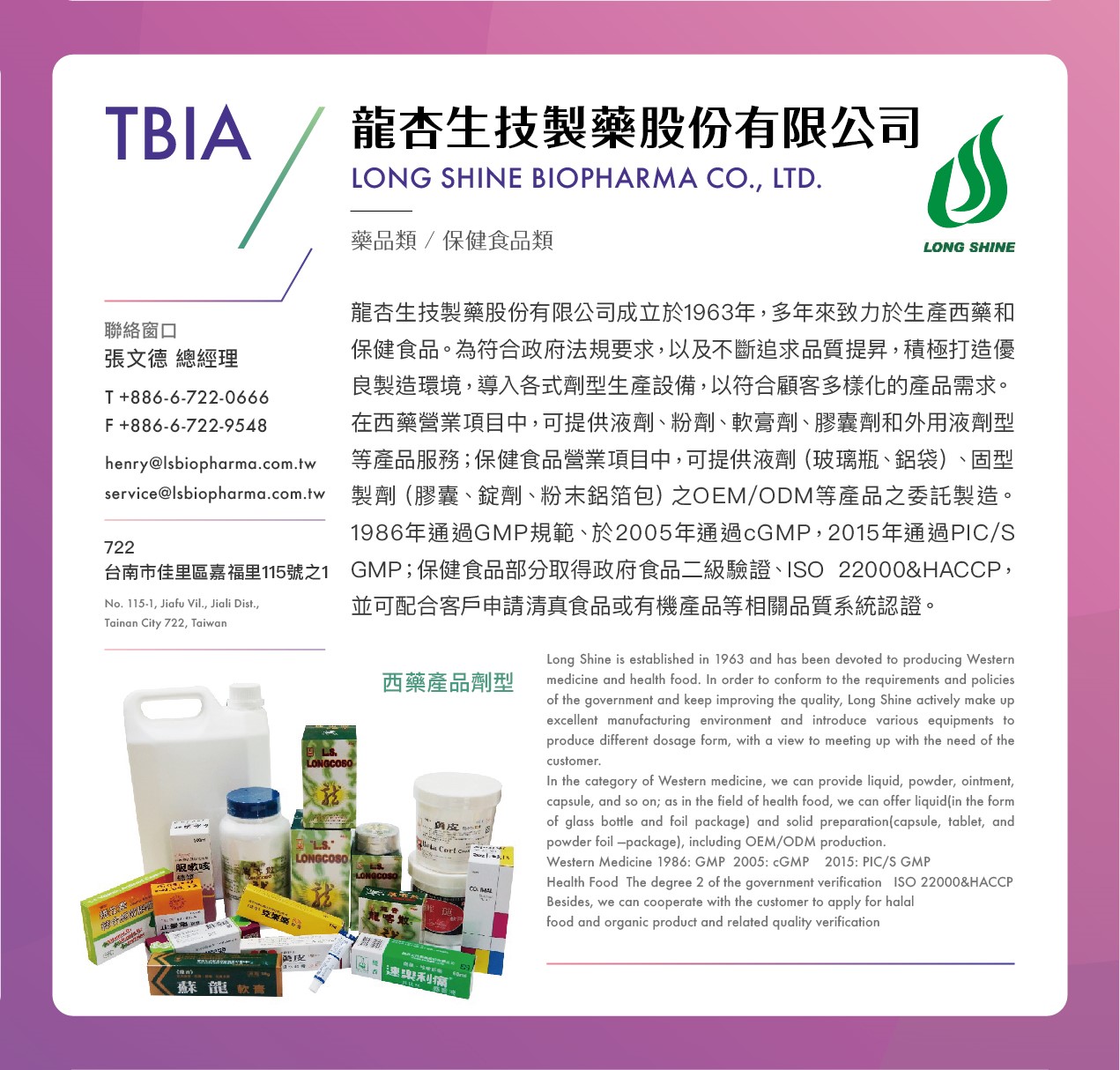 龍杏生技製藥股份有限公司(原名龍杏化學製藥股份有限公司) 於1963年創立於台中市,1980年於台南縣佳里鎮購地6300坪,新建符合GMP廠房,1987年通過GMP規範,1990年增建廠房並設立中藥廠、食品廠,2001年再增建,設立化妝品廠,2002年通過cGMP,2004年增資並增建生物科技大樓,建坪1400坪樓高4層,專門從事生物科技之研究及生產生物科技產品,公司也更名為龍杏生技製藥股份有限公司。2005年通過西藥cGMP第三階段及中藥GMP查廠審查。