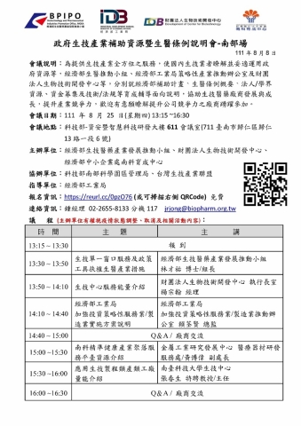 8/25「政府生技產業補助資源暨生醫條例說明會-南部場」