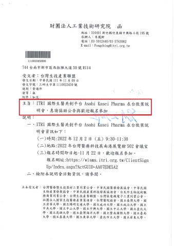 【財團法人工業技術研究院】工研生字第1110023459「ITRI國際生醫共創平台Asahi Kasei Pharma 在台徵案說明會」,惠請協助公告與歡迎報名參加。