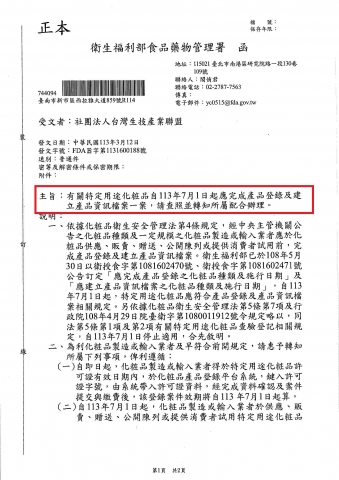 有關特定用途化妝品自113年7月1日起應完成產品登錄及建立產品資訊檔案一案,請查照並轉知所屬配合辦理。