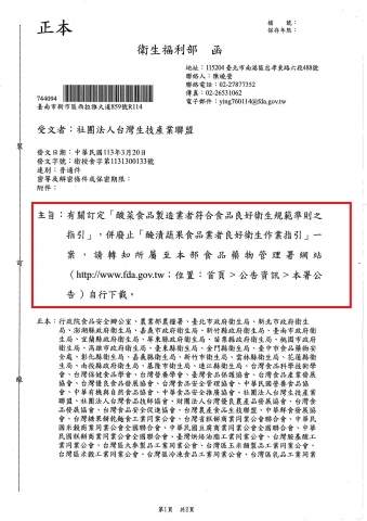 有關訂定「酸菜食品製造業者符合食品良好衛生規範準則之指引」,並廢止「醃漬蔬果食品業者良好衛生作業指引」一案,請轉知所屬至本部食品藥物管理署網站(http://www.fda.gov.tw;位置:首頁>公告資訊>本署公告)自行下載。