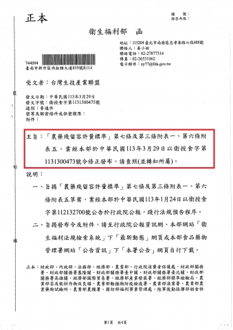 「農藥殘留容許量標準」第七條及第三條附表一、第六條附表五,業經本部於中華民國113年3月29日以衛授食字第1131300473號令修正發布,請查照(並轉知所屬)。