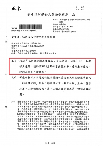 檢送「化粧品範圍及種類表」修正草案(初稿)1份,如有修正建議,請於113年4月30日前函復本署,逾期未回復者,視同無意見,請查照。