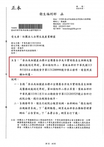「食品及相關產品標示宣傳廣告涉及不實誇張易產生誤解或醫療效能認定準則」第四條附件二,業經本部於中華民國113年5月8日以衛授食字第1131200998號令修正發布,請查照並轉知所屬。