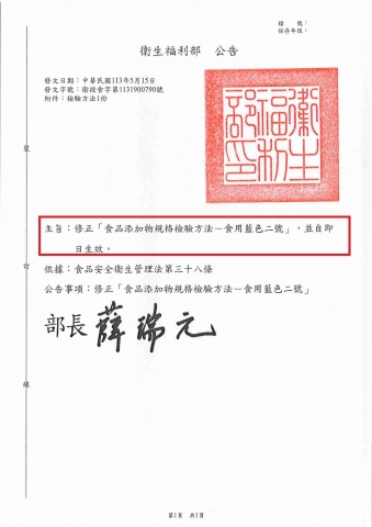 【衛生福利部】 衛授食字第1131900790號-修正「食品添加物規格檢驗方法-食用藍色二號」