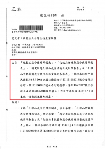 【衛生福利部】 衛授食字第1131602022號 「化粧品成分使用限制表」、「化粧品防曬劑成分使用限制表」、「特定用途化粧品成分名稱及使用限制表」及「化粧品中抗菌劑成分使用及限量規定基準表」