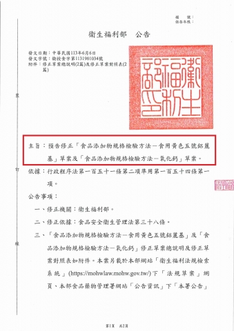 【衛生福利部】衛授食字第1131901034號預告修正「食品添加物規格檢驗方法-食用黃色五號鋁麗基」草案及「食品添加物規格檢驗方法-氧化鈣」草案