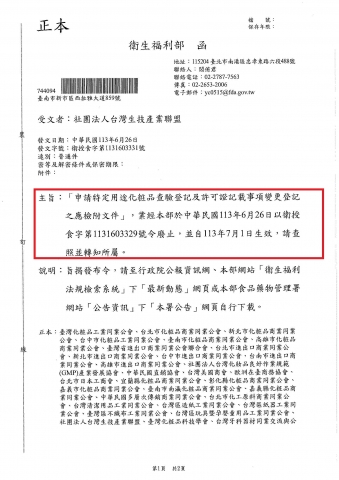「應建立產品資訊檔案之化粧品種類及實施日期」與「應建立產品資訊檔案之化粧品種類及施行日期」,業經本部於中華民國113年6月26日分別以衛授食字第1131604608號公告訂定發布與第1131604609號公告廢止,並自113年7月1日生效,請查照並轉知所屬。