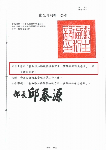 【衛生福利部】 衛授食字第1131901655號_修正「食品添加物規格檢驗方法-矽酸鋁鉀珠光色素」