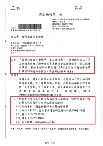 「農藥殘留容許標準」第三條附表一、第四條附表三、第五條附表四及「動物產品中農藥殘留容許量標準」第三條修正草案,業經本部於中華民國113年8月15日以衛授食字第1131300906號公告預告,請查照(並轉知所屬)。