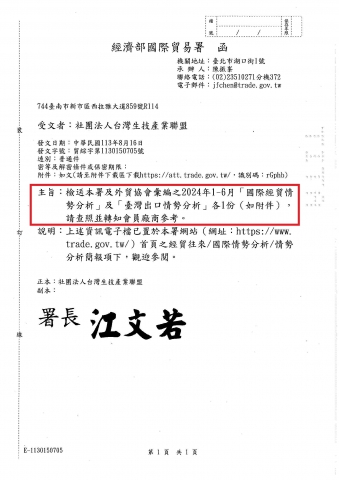 【經濟部國際貿易署】 貿綜字第1130150705號_外貿協會彙編之2024年1-6月「國際經貿情勢分析」及「臺灣出口情勢分析」