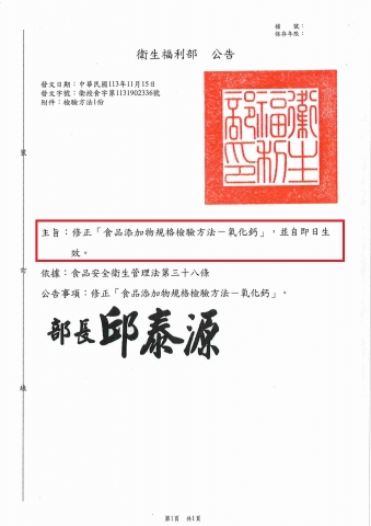 【衛生福利部】 衛授食字第1131902336號_修正「食品添加物規格檢驗方法-氧化鈣」