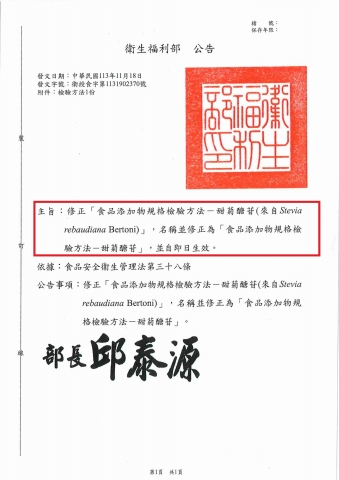 【衛生福利部】 衛授食字第1131902370號_修正「食品添加物規格檢驗方法-甜菊糖苷」