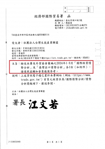 【經濟部國際貿易署】 貿展字第1130550290號_2024年1-9月「國際經貿情勢分析」及「臺灣出口情勢分析」