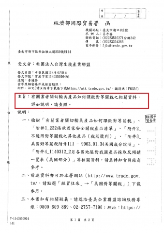 【經濟部國際貿易署】 貿展字第1140550904號_有關業者關切輸美產品如何課徵對等關稅之相關資料