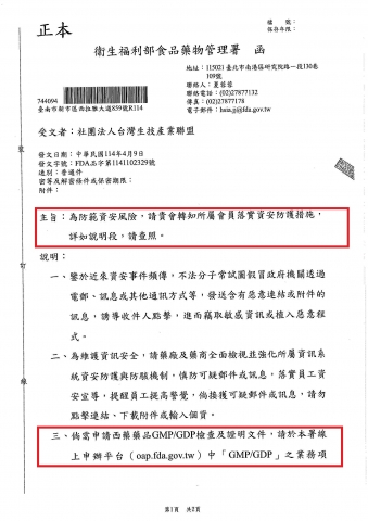 【衛生福利部食品藥物管理署】 FDA品字第1141102329號_ 為防範資安風險落實資安防護措施