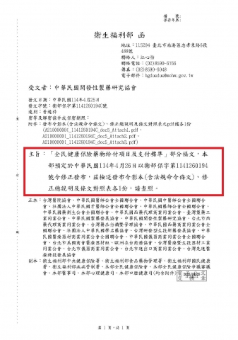 「全民健康保險藥物給付項目及支付標準」部分條文,本部預定於中華民國114年4月26日以衛部保字第1141260194號令修正發布,茲檢送發布令影本(含法規命令條文)、修正總說明及條文對照表各1份,請查照