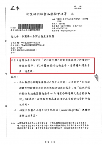 有關本署公告訂定「定性檢測體外診斷醫療器材分析性能評估技術基準」等2項醫療器材技術基準,惠請轉知所屬會員,請查照。