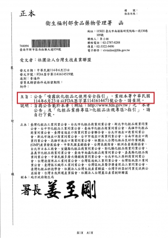 公告「噴霧狀化粧品之使用安全指引」,業經本署中華民國114年6月23日以FDA器字第1141614471號公告,請查照。