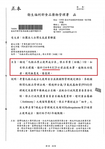 檢送「化粧品禁止使用成分表」修正草案(初稿)1份,如有修正建議,請於114年8月25日前函復本署,逾期未回復者,視同無意見,請查照。