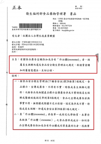 【衛生福利部食品藥物管理署】FDA企字第1141202105號_食品廣告宣稱添加或含有「外泌體(exosome)」
