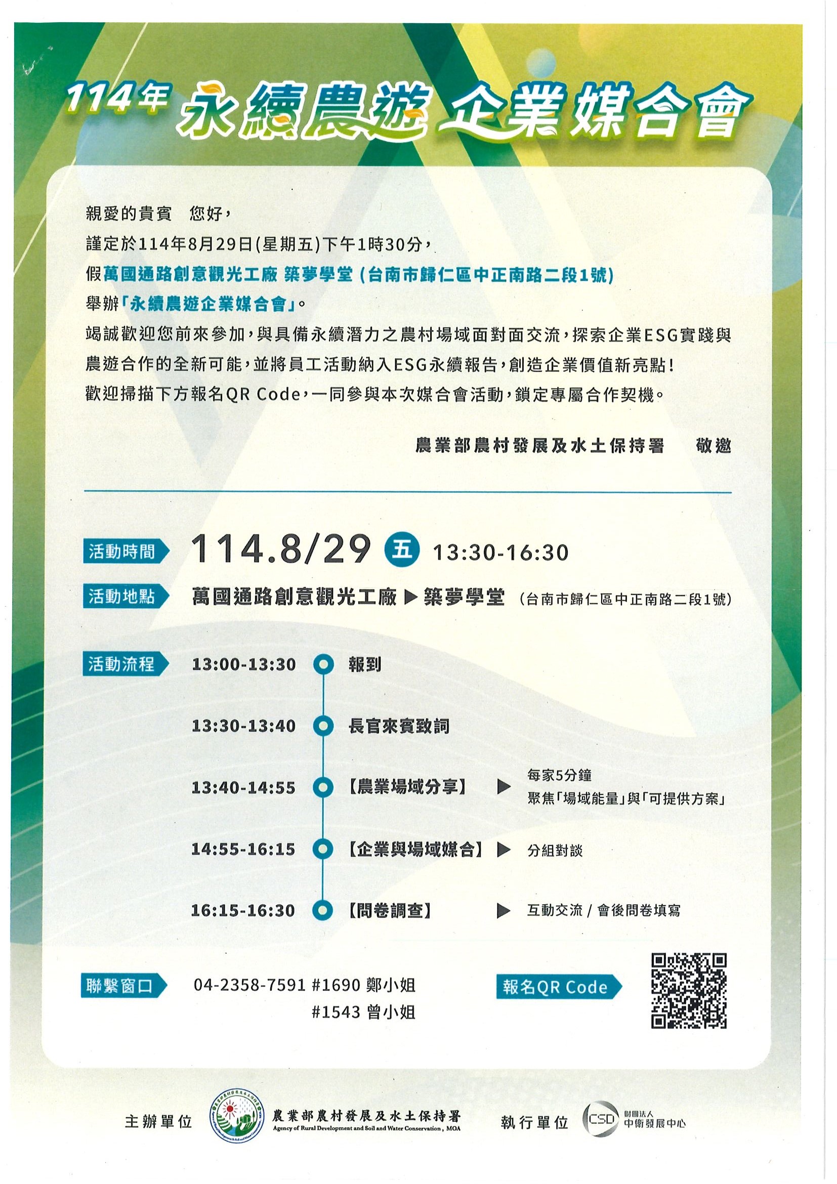 敬邀參與本署114年8月29日(五)下午1時30分假晚國通路創意觀光工廠築夢學堂(台南市歸仁區中正南路二段1號)辦理之「永續農遊企業媒合會」,詳如說明,請查照。