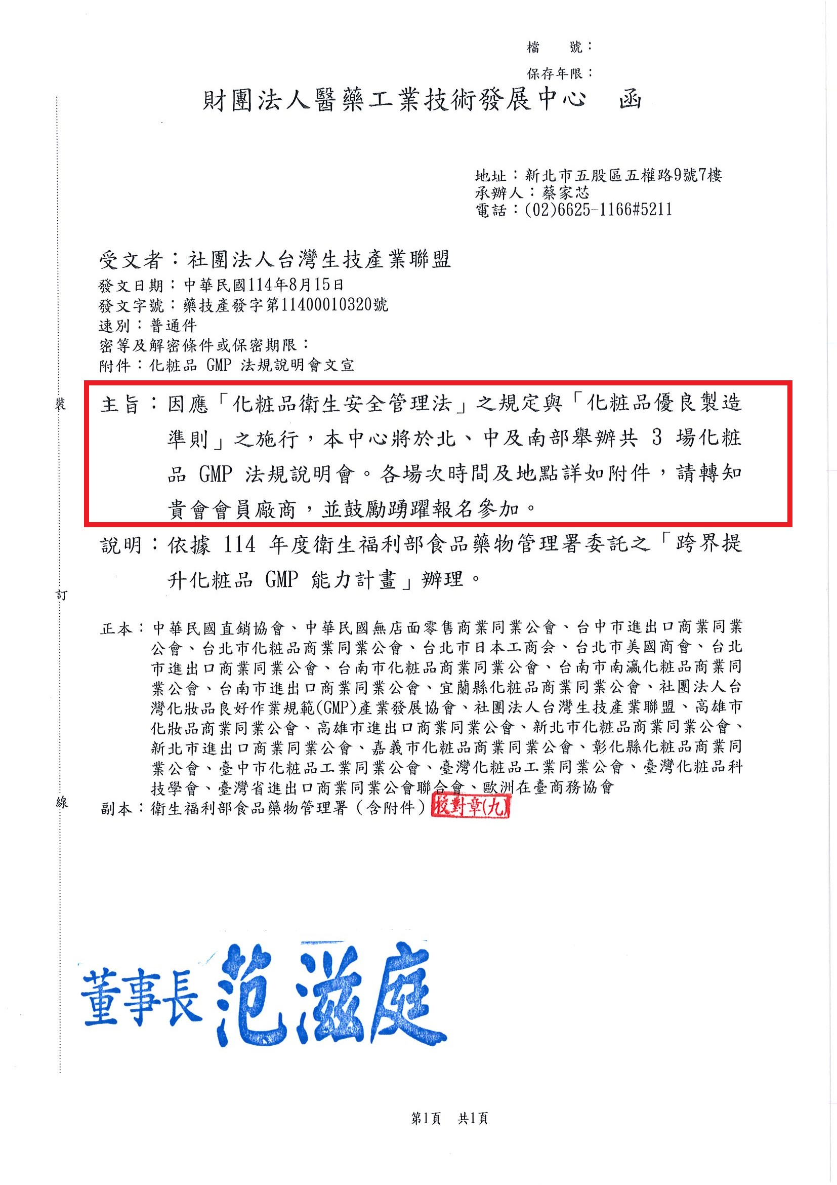 【財團法人醫藥工業技術發展中心】 藥技產發字第11400010320號_化粧品GMP法規說明會