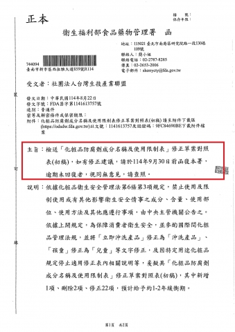 檢送「化粧品防腐劑成分名稱及使用限制表」修正草案對照表(初稿),如有修正建議,請於114年9月30日前函復本署,預期未回復者,視同無意見,請查照。