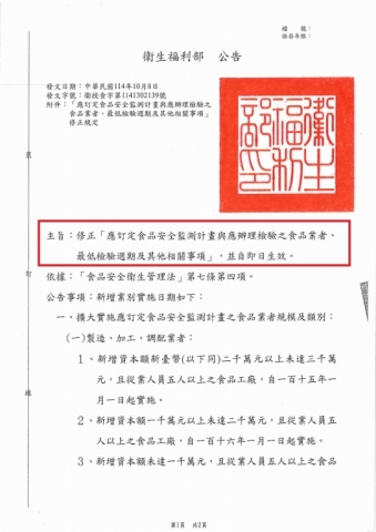【衛生福利部】衛授食字第1141302139號_修正「應訂定食品安全監測計畫與應辦理檢驗之食品業者、最低檢驗週期及其他相關事項」