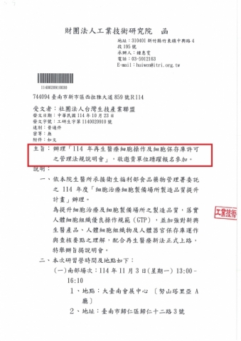 【財團法人工業技術研究院】工研生字第1140020910號_「114年再生醫療細胞操作及細胞保存庫許可之管理法規說明會」