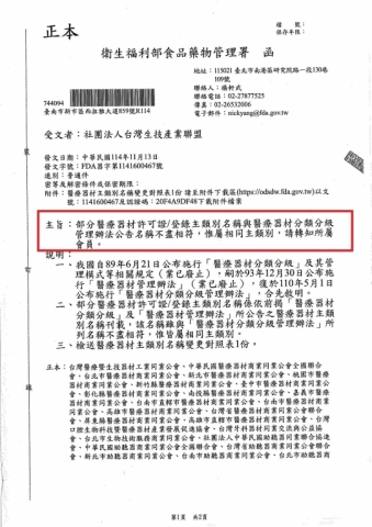 【衛生福利部食品藥物管理署】FDA器字第1141600467號_部分醫療器材許可證/登陸主類別名稱與醫療器材分類分級管理辦法公告名稱不盡相符