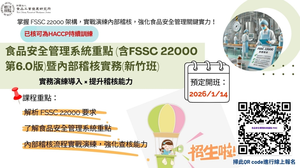 • 【財團法人食品工業發展研究所】 2026/01/14 FSSC 22000 第6.0版食品安全管理系統之重點—食品品質與安全管理要求