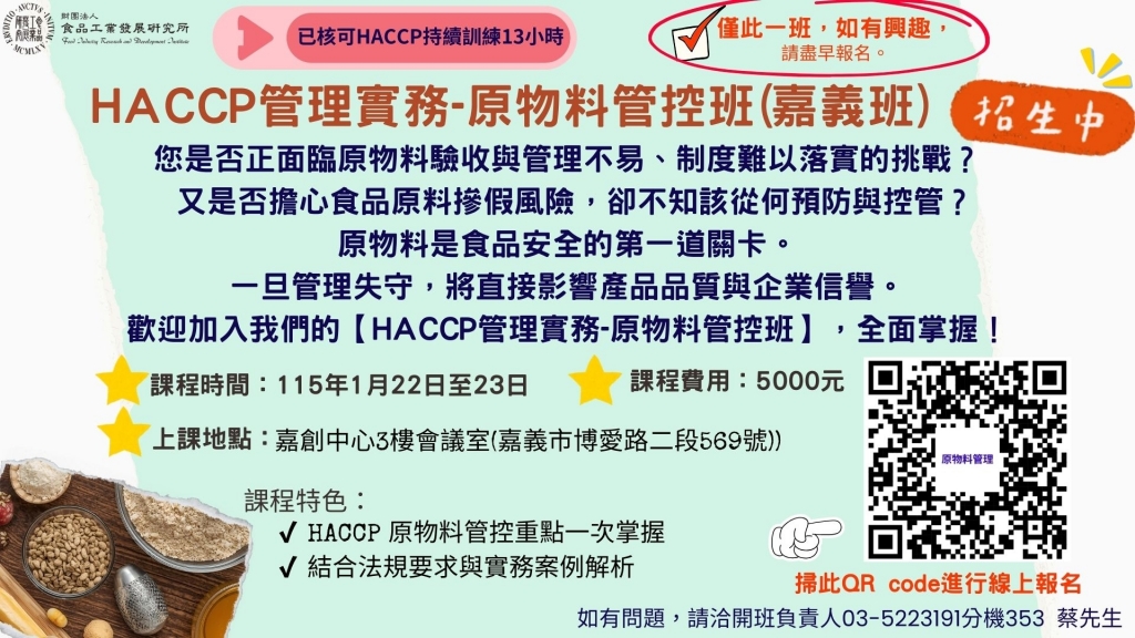 【財團法人食品工業發展研究所】HACCP管理實務-原物料管控班(嘉義班) 01/22-23
