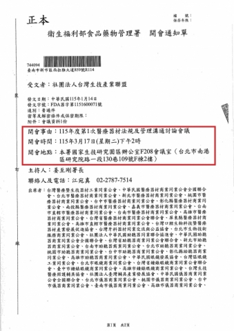 【衛生福利部食品藥物管理署】FDA器字第1151600071號_115年度第1次醫療器材法規及管理溝通討論會議