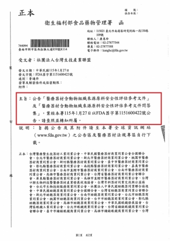 公告「醫療器材含動物組織來源原料安全性評估參考文件」及「醫療器材含動物組織來源原料安全性評估參考文件問答集」,業經本署115年1月27日以FDA器字第1151600422號公告,請查照並轉知所屬。