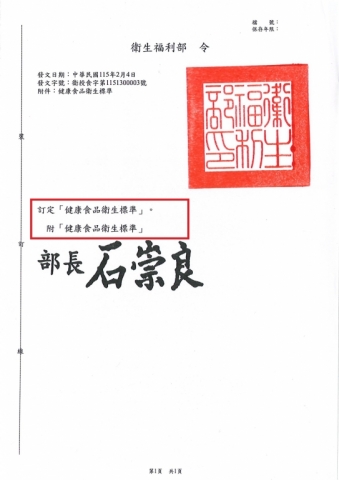 【衛生福利部】訂定「健康食品衛生標準」_衛授食字第1151300003號