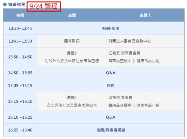 【醫藥查驗中心】健康食品查驗登記法規暨常見缺失宣導溝通說明會9/24