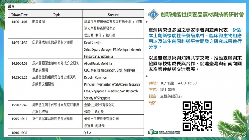 本次經濟部生技醫藥產業發展推動小組舉辦「創新機能性保養品素材與技術研討會」,特別邀請臺灣與東協多國之專家學者與產業代表,針對本土創新機能性保養品素材、臨床微生物組應用以及益生菌原料與平台開發之研究成果進行分享,以達雙邊技術與知識共享交流,推動臺灣與東協國家技術成長與合作,促進臺灣與新南向國家產業連結與交流發展。