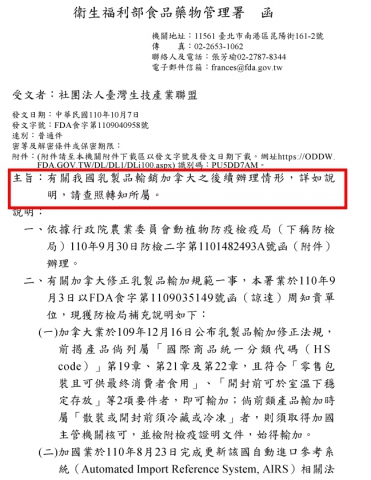 轉知-衛生福利部 有關我國乳製品輸銷加拿大之後續辦理情形,詳如說明。