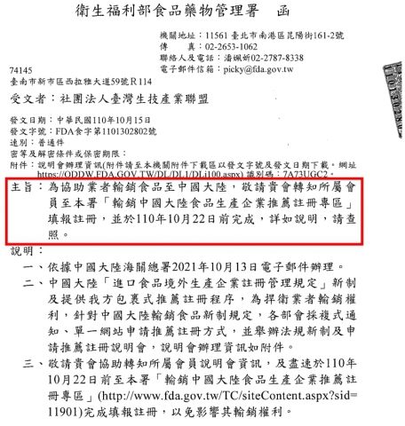 【衛生福利部】為協助業者輸銷食品至中國大陸,請至本署「輸銷中國大陸食品生產企業推薦註冊專區」填報註冊,並於110年10月22日完成。
