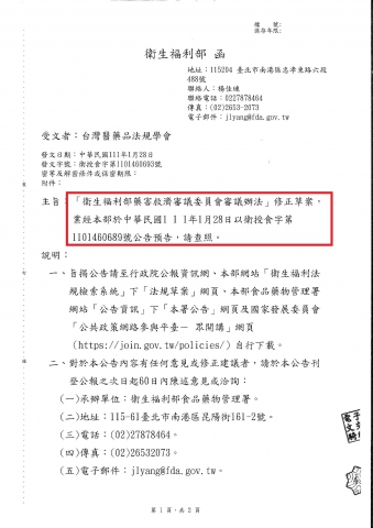 【衛生福利部】「衛生福利部藥害救濟審議委員會審議辦法」修正草案,業經本部於中華民國111年1月28日以衛授食字第1101460689號公告預告,請查照。