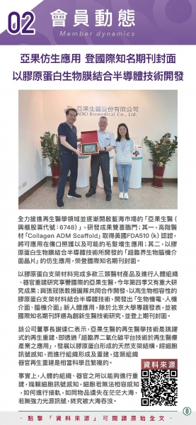 以膠原蛋白支架材料完成多款三類醫材產品及進行人體組織、器官重建研究享譽國際的亞果生醫,今年第四季又有重大研究成果;與張冠張教授團隊共同合作開發,以高生物相容性的膠原蛋白支架材料結合半導體技術,開發出「生物機電、人機介面、腦機介面」新人體應用,除於北京大學專題發表,並被國際知名期刊評選為創新生醫技術研究,並登上期刊封面。